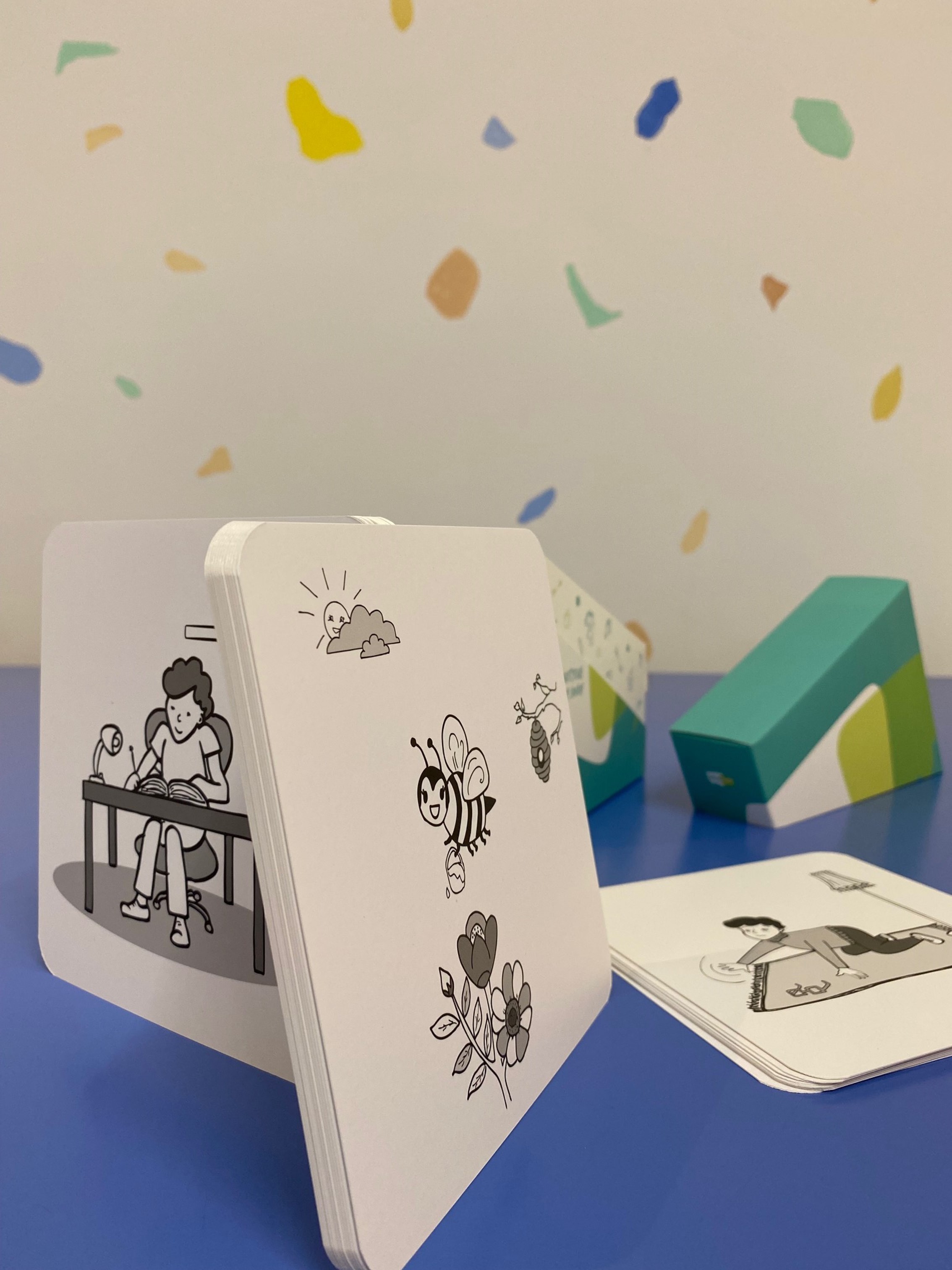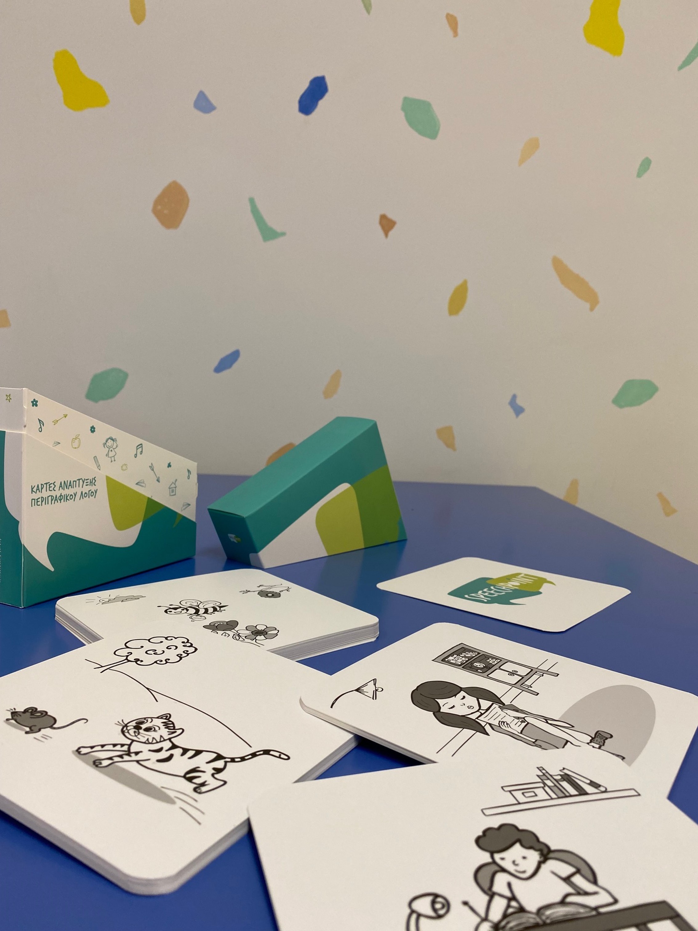 Οι κάρτες ανάπτυξης Περιγραφικού Λόγου (προφορικός κ γραπτός) δημιουργήθηκαν προκειμένου να βοηθήσουν μέσω της οπτικοποίησης, παιδιά προσχολικής και σχολικής ηλικίας στην ανάπτυξη προφορικής ή/και γραπτής έκφρασης και στην περιγραφική ικανότητα. Η εικονογράφηση του υλικού λειτουργεί ώς γενικό πλάνο αναφοράς κι έχει δημιουργηθεί έτσι ώστε να μπορούν να εξελιχθούν οι παραπάνω δεξιότητες ανάλογα με το δυναμικό του παιδιού ή το στόχο του εκπαιδευτή/ γονέα. Για κάθε ρήμα στόχο υπάρχουν 8 κάρτες περιγραφής. Το επαναλαμβανόμενο αυτό μοντέλο βοηθά τα παιδιά να αφομοιώσουν τον τρόπο περιγραφής, αρχικά να το μιμηθούν, και έπειτα να τον εξελίξουν.